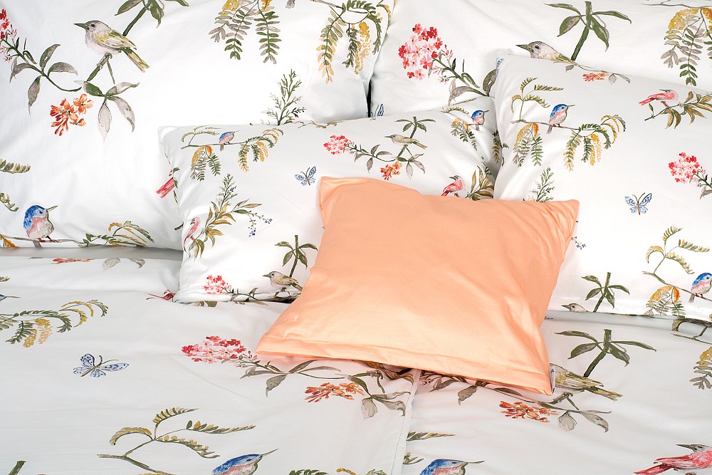 Az ágyneműhuzat fehér felületét romantikus virágminta és élethű madarak díszítik.