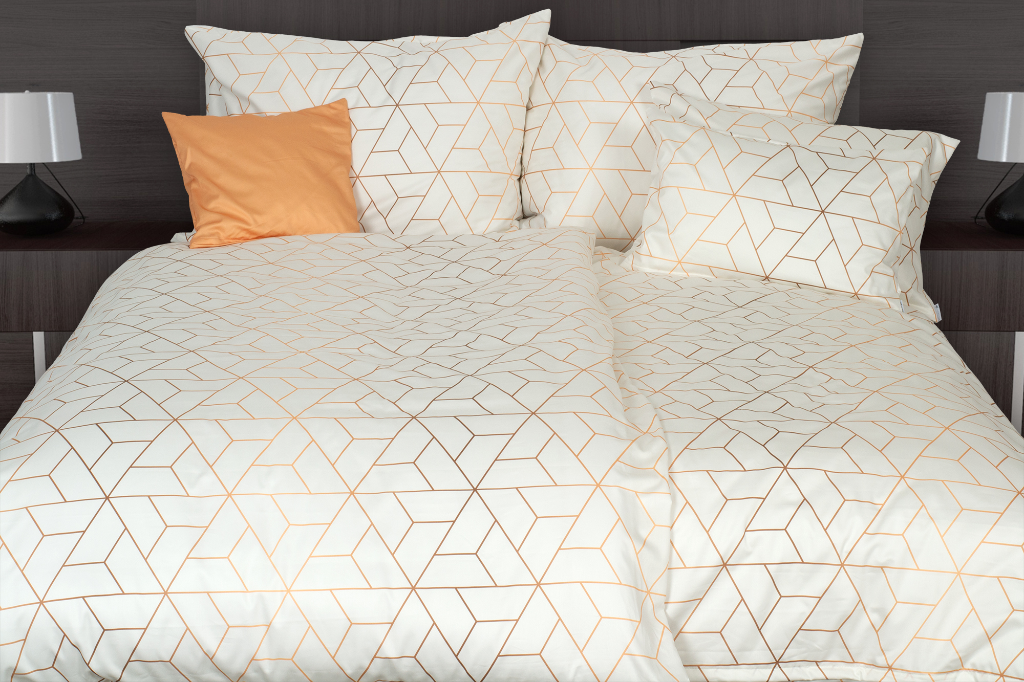 Az ágyneműhuzat finom krémszínű alapját arany geometrikus minta díszíti. Tökéletes eredményt díszpárnahuzatokkal érhet el.