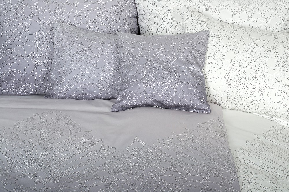 Finom geometrikus mintát nemcsak az ágyneműhuzat elülső, szürkéslila oldalán, de az ágyhuzat fehér hátulsó oldalán is talál.