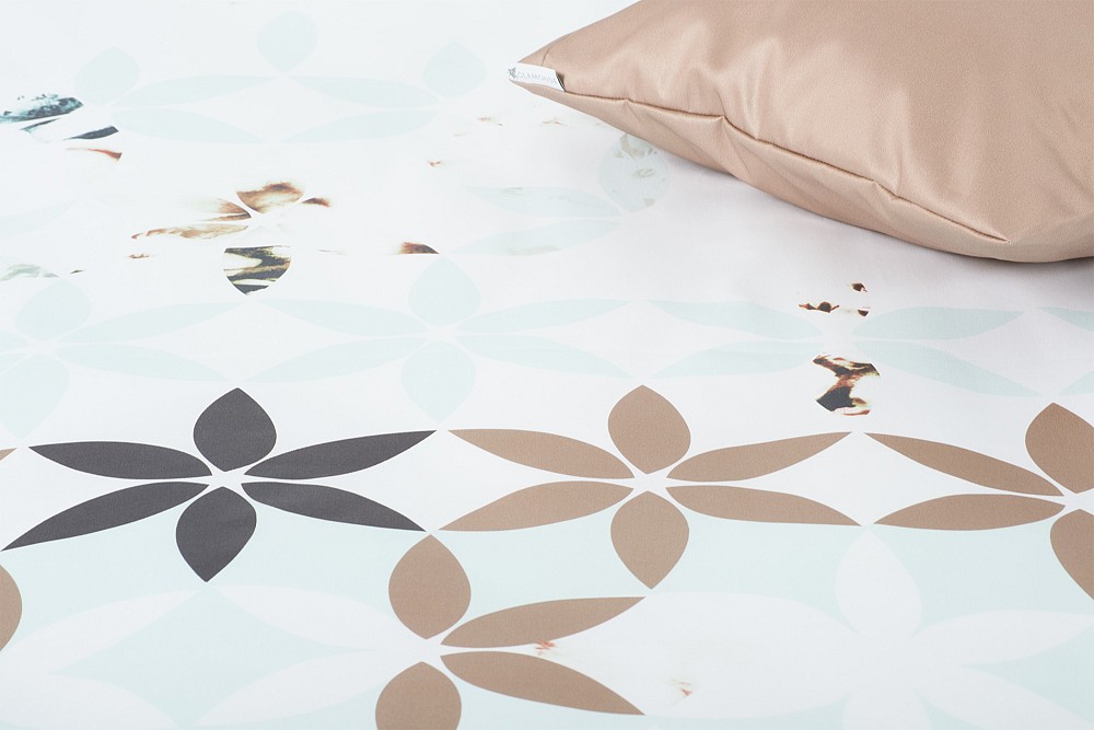 Finom világoskék ágyneműhuzat barna virágokkal.