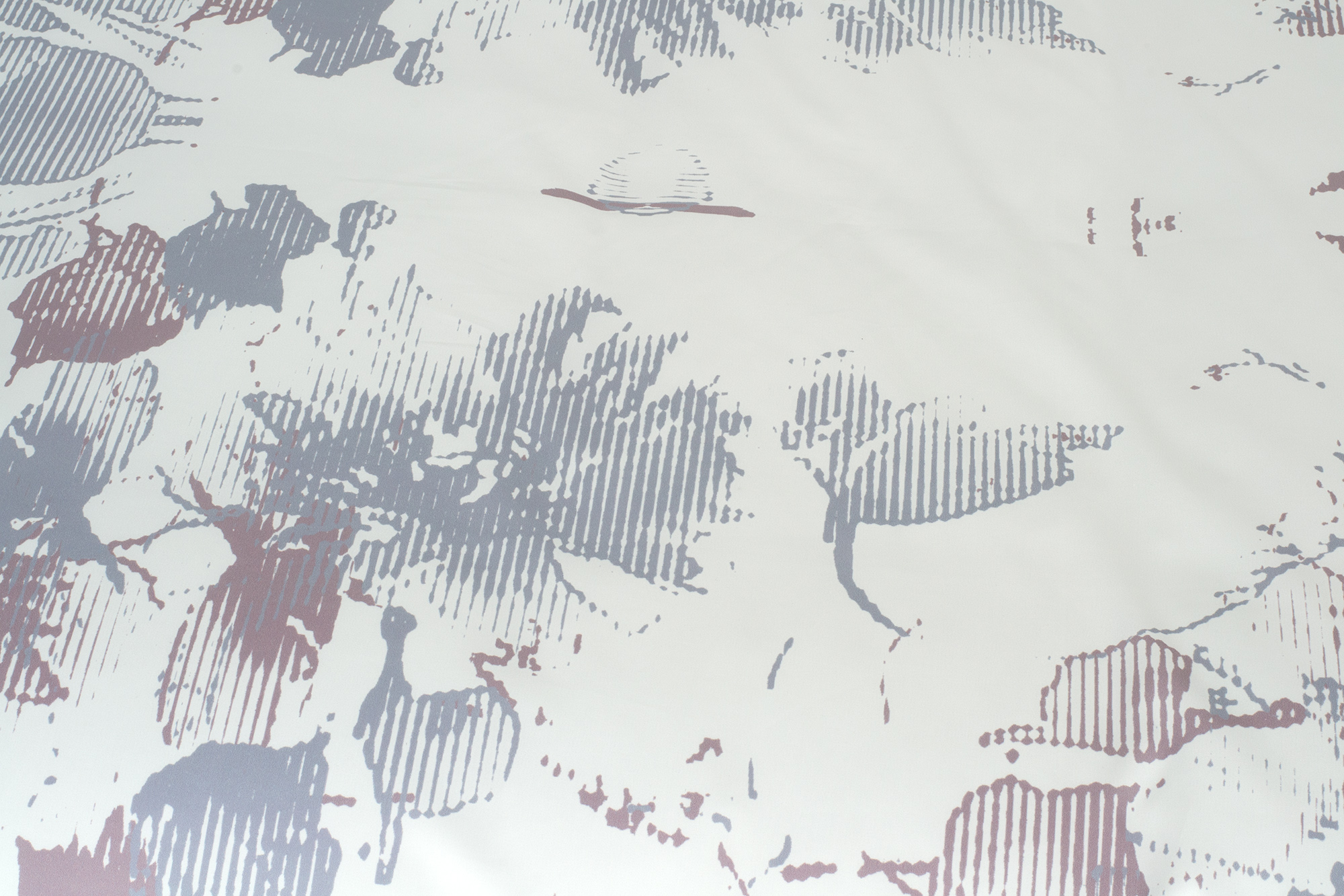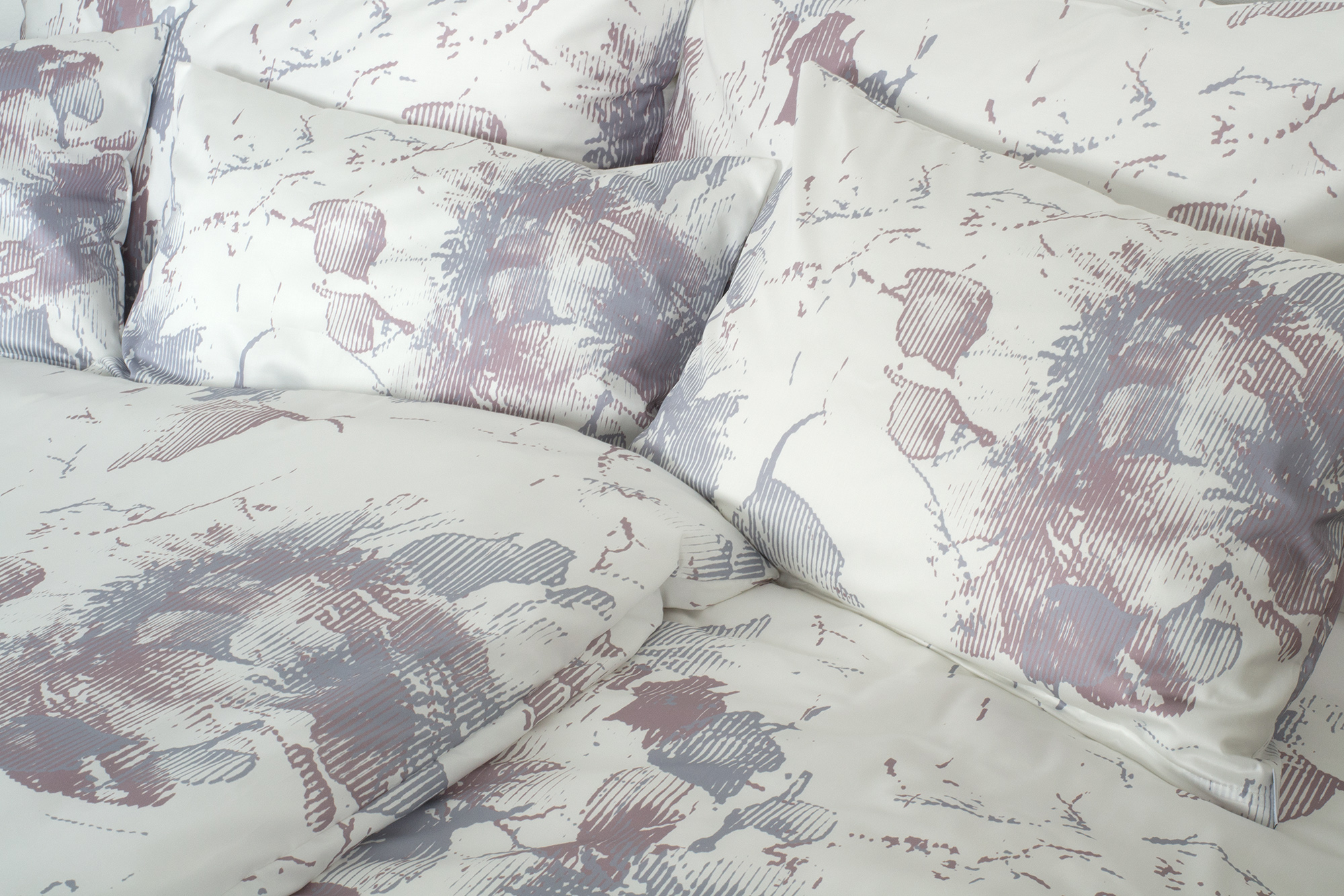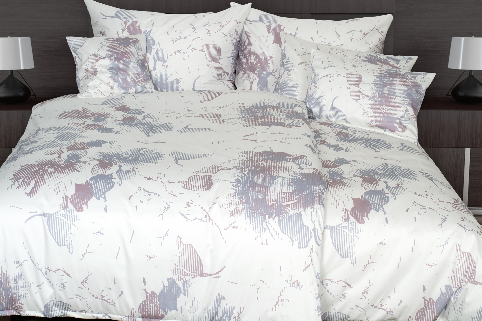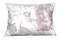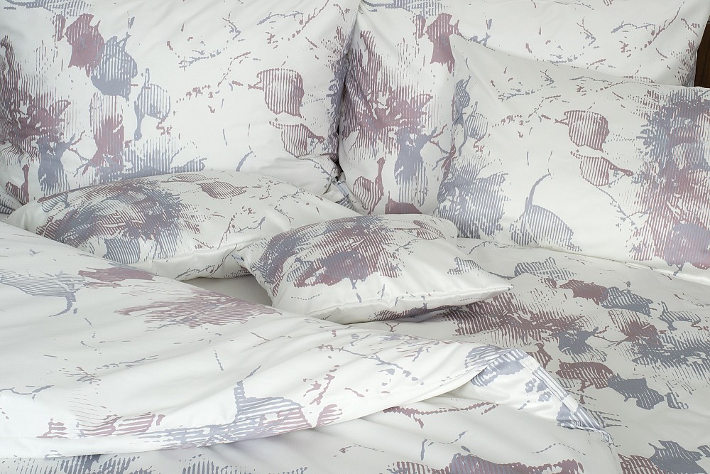 Az ágyneműhuzat fehér alapszínét absztrakt virágminta díszíti lila és szürkéskék árnyalatokban.