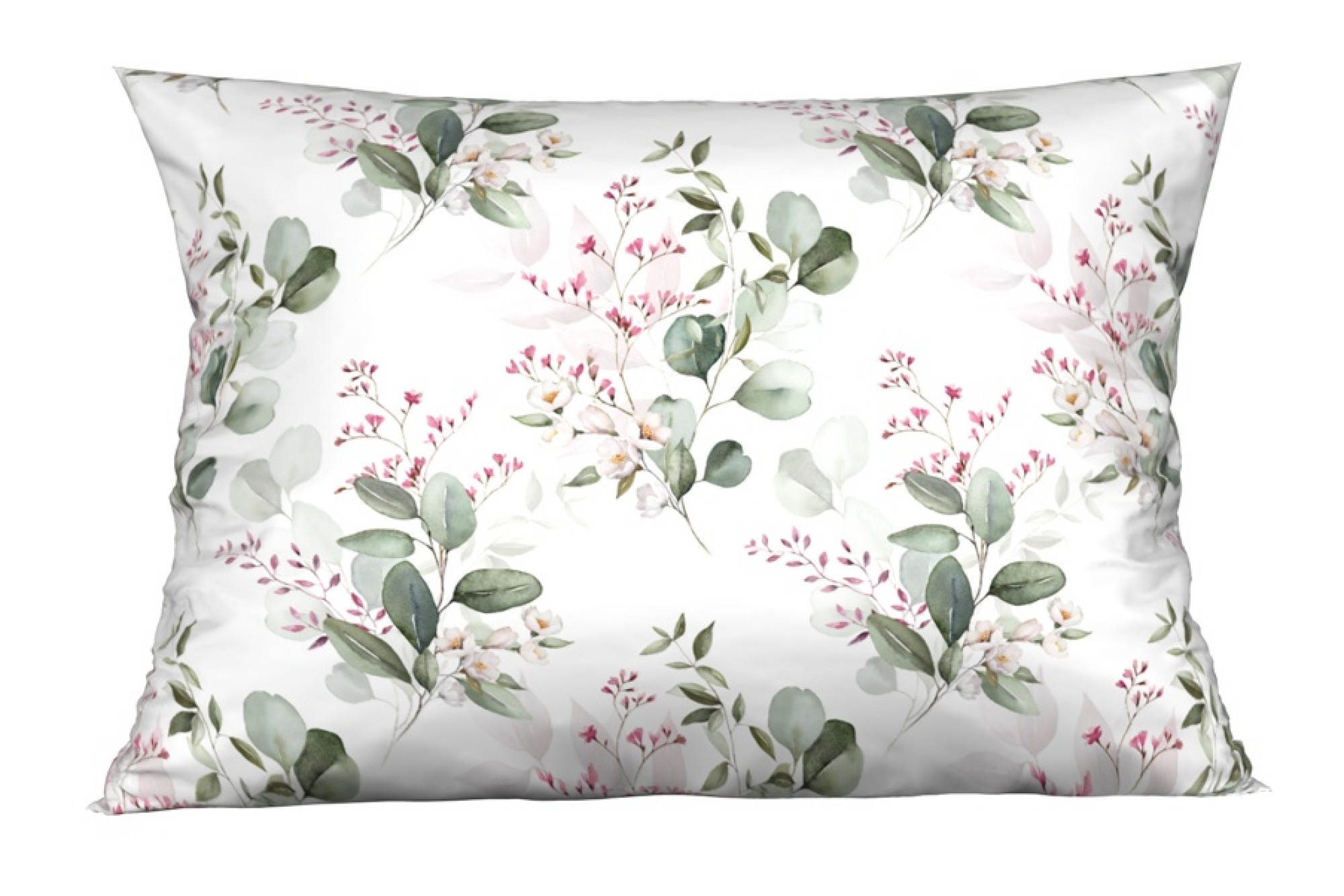 Ezt a gyönyörű mintát fehér alapra nyomtattuk, hogy a finom pasztellrózsaszín virágok és a zöld eukaliptusz levelek még jobban kiemelkedjenek. A díszpárnához grafikusan redukáltuk a fő motívumot, ami kiemeli a minta finomságát.