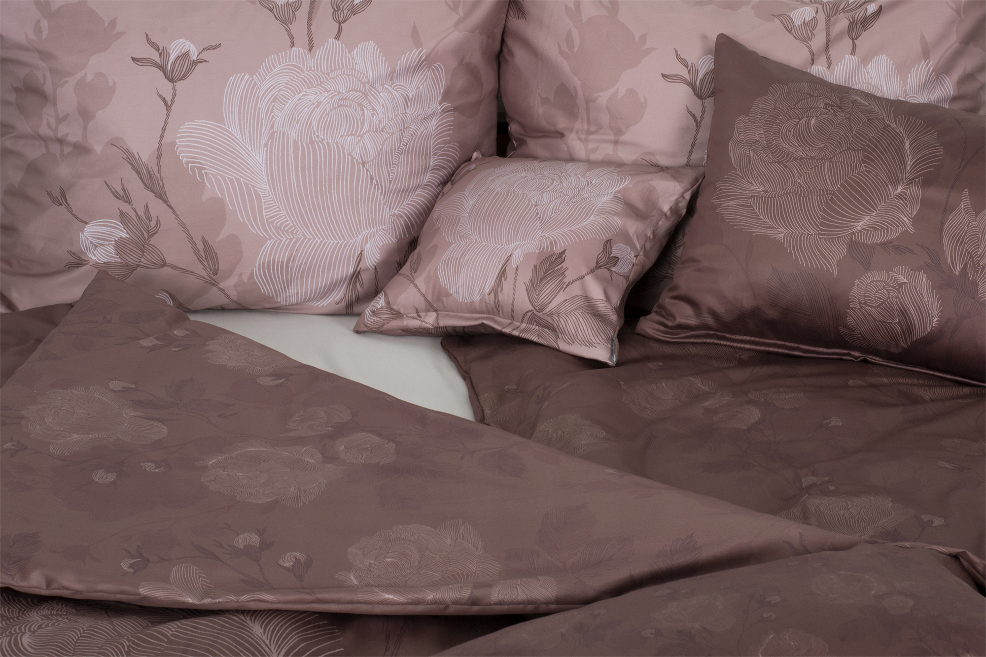 Az ágyneműhuzat sötétbarna alapszínét leegyszerűsített rózsa minta díszít.
