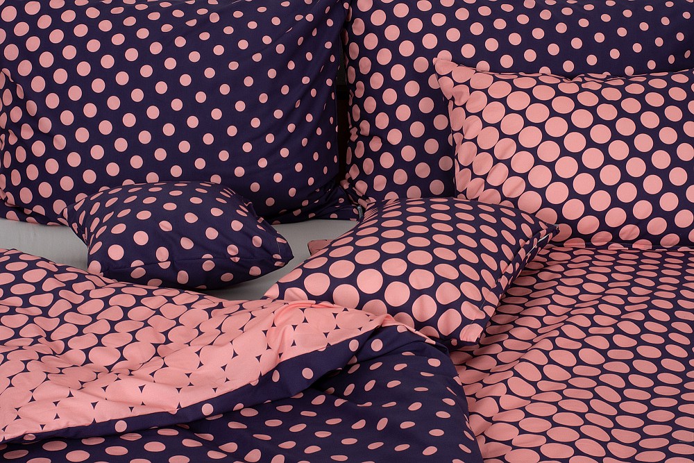 Pöttyök, ameddig a szem ellát! A legkisebbtől a legnagyobbig terjedő rózsaszín pöttyök az ágynemű teljes sötétlila felületét foglalják el.