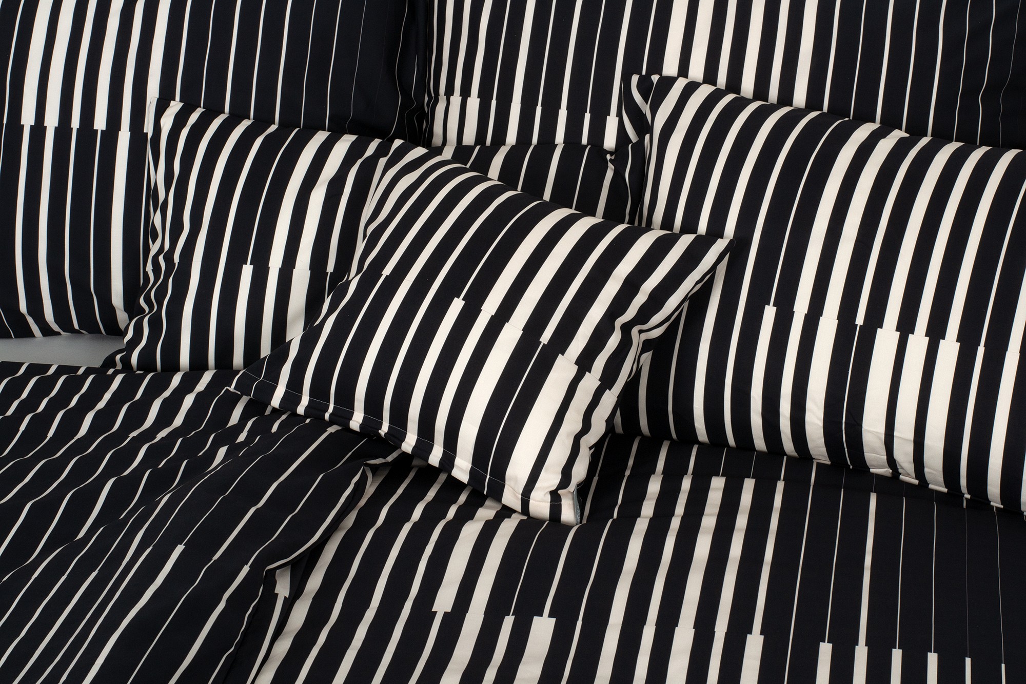 Az ágyneműhuzat felületét, változó szélességű fekete és krémszínű csíkok jellemzik.