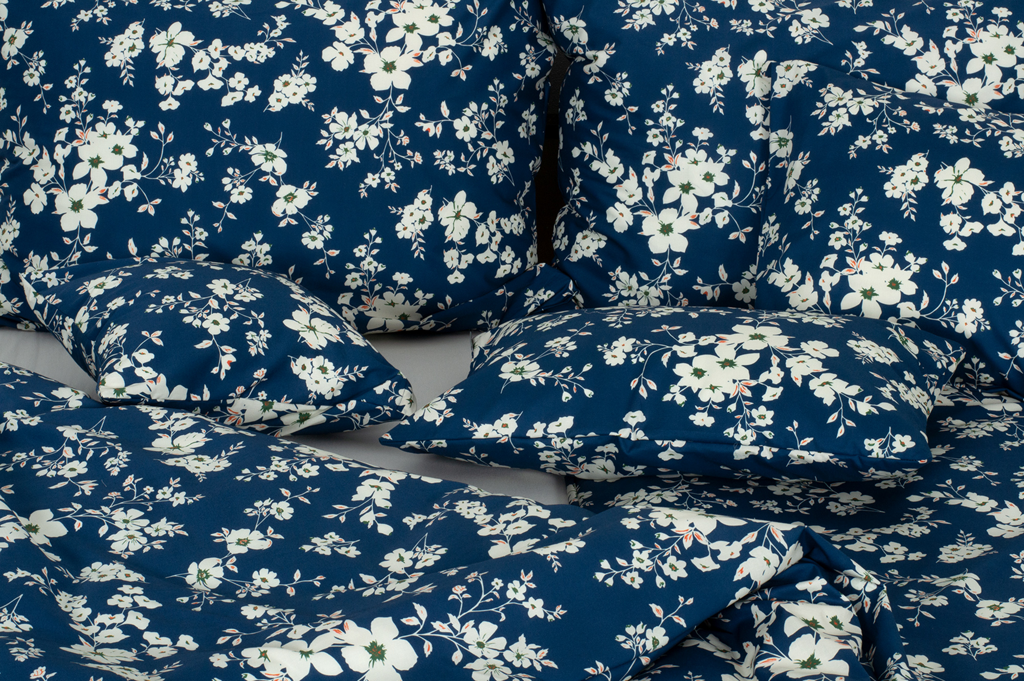 Az ágynemű kék hátterét apró fehér virágokkal teli gallyak díszítik.