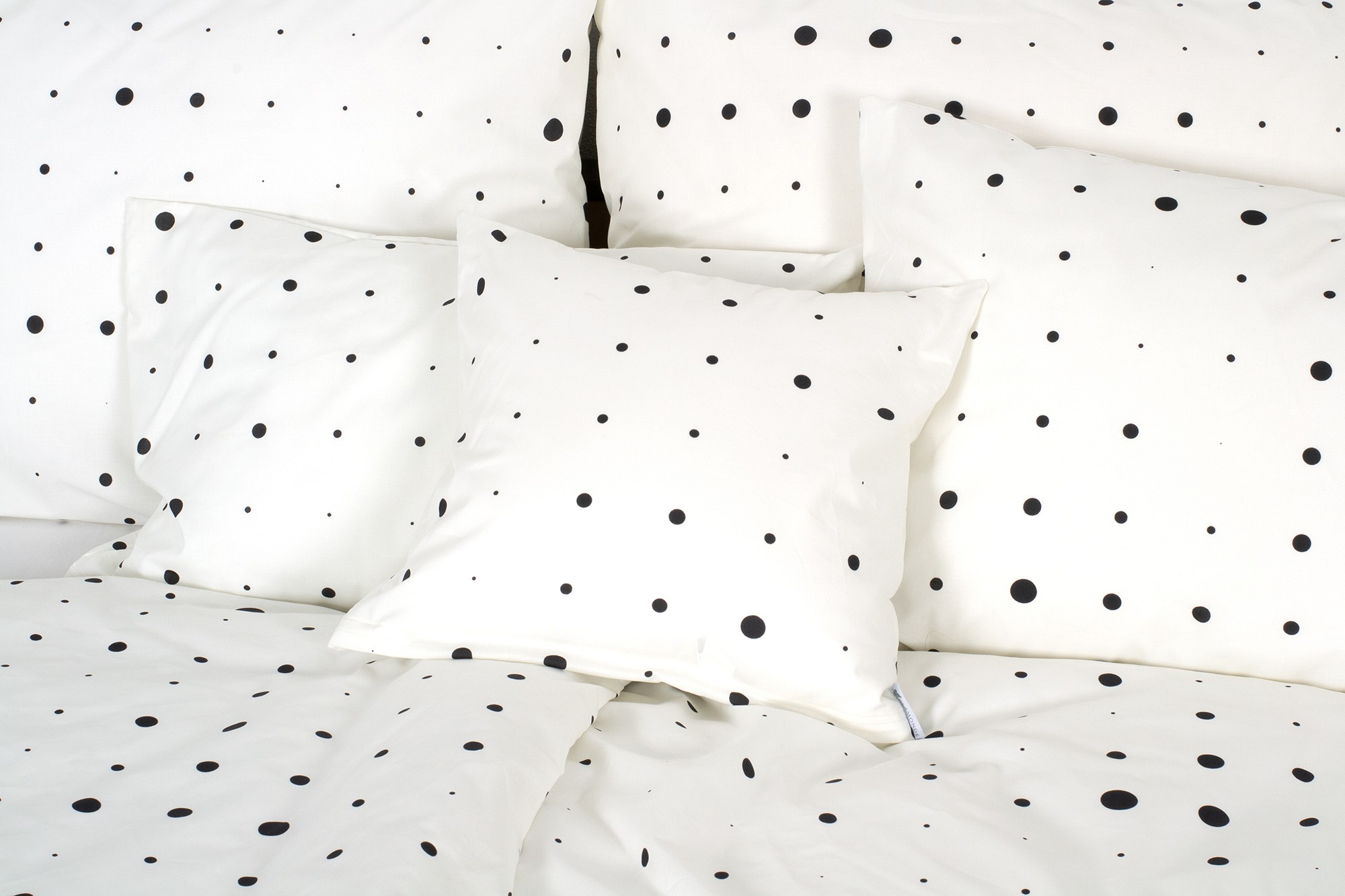 Az ágynemű krém alapját egyenletesen szétszórt, különböző méretű fekete pöttyök borítják.